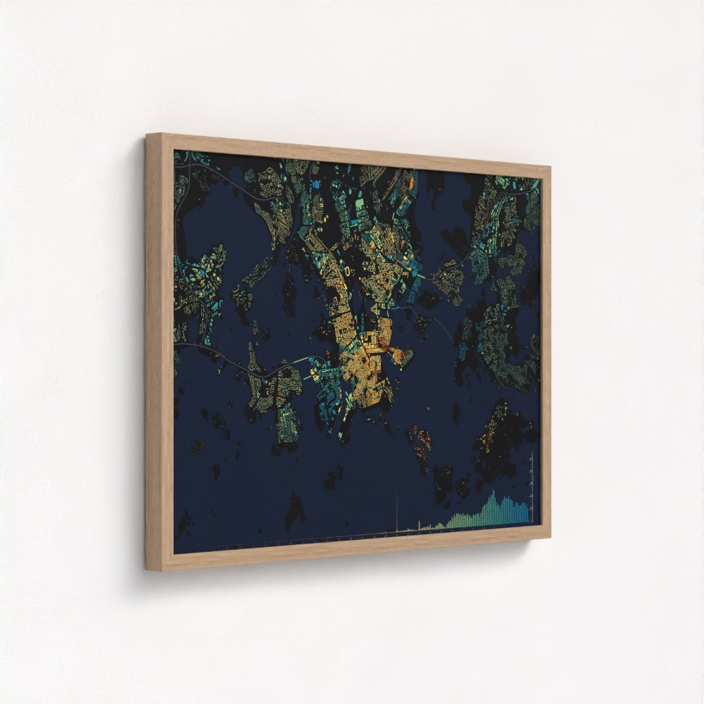 A printed version of the interactive map of the age of buildings of Helsinki. Visualization of the construction dates of buildings made with colour ramp inspired by Helsinki. Complemented with the graph showing the distribution of the number of buildings per year.